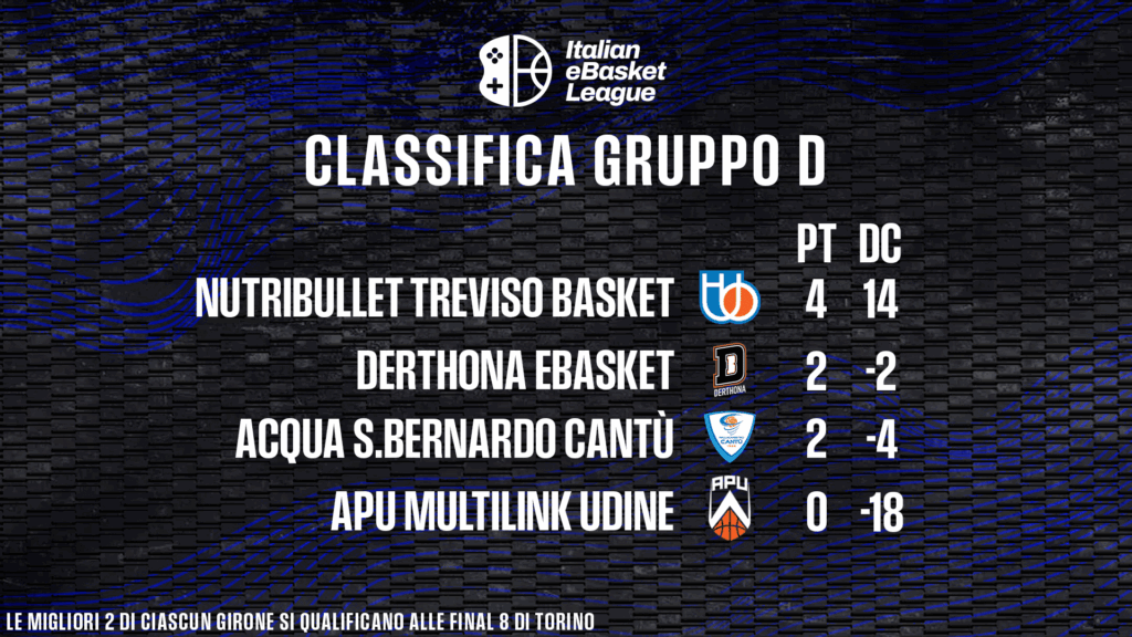 Girone D nel segno della Nutribullet Treviso, grazie alla vittoria, la seconda, nel raggruppamento, contro l’APU Multilink Udine (22-10). Ruggito del Derthona eBasket, che batte l’Acqua San Bernardo Cantù per 21-11 centrando così la prima vittoria nel torneo.