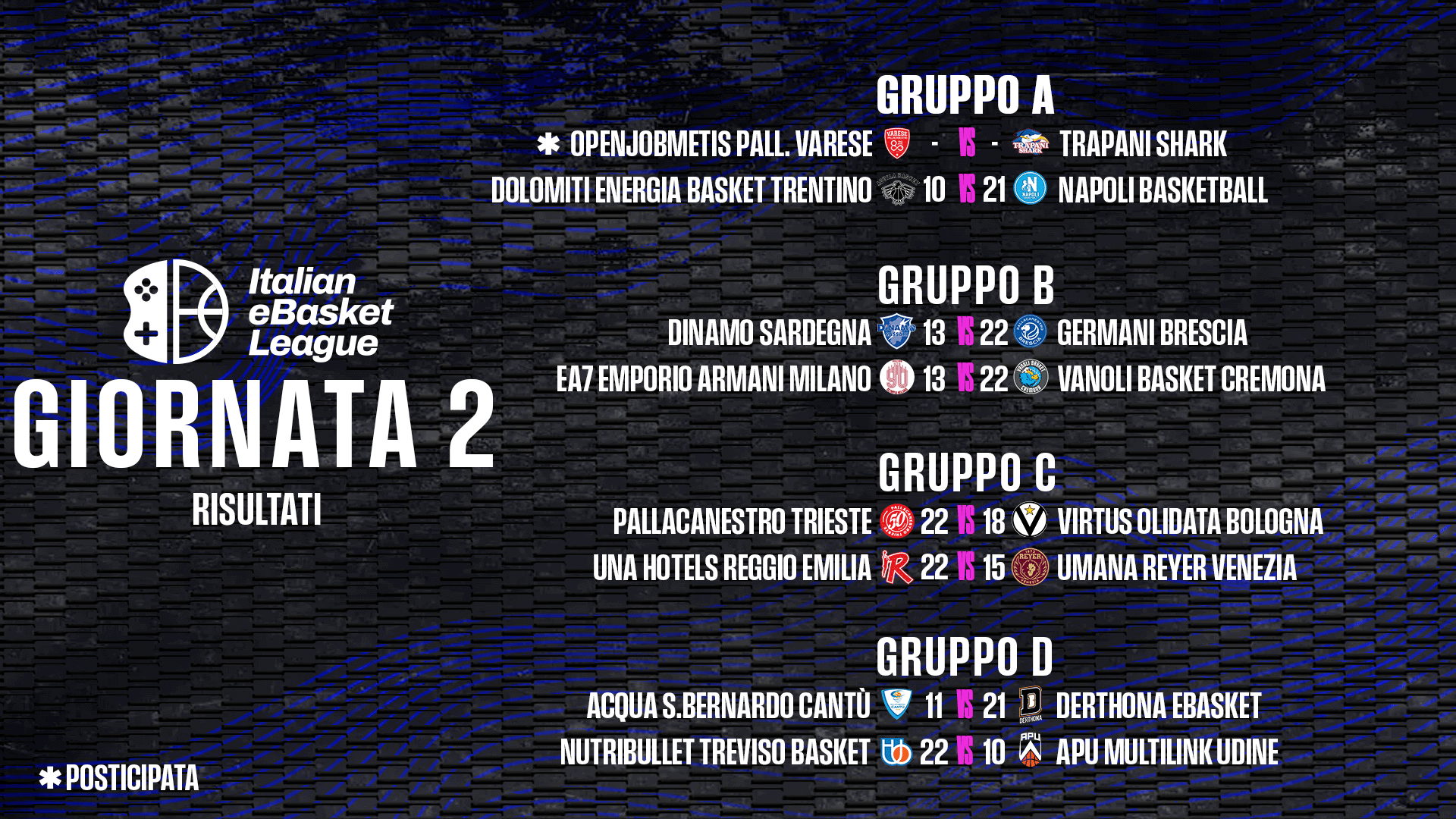 Andando alla seconda giornata di gare, nel Girone A pronto riscatto per il Napoli Basketball – con il roster di gamers Campioni d’Italia in carica – che, dopo essere andato ko all’esordio contro Varese, liquida la Dolomiti Energia Trentino 21-10. Posticipata la gara fra Trapani Shark e Openjobmetis Varese.
