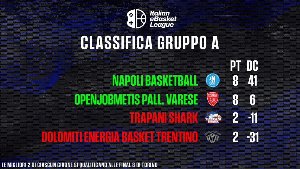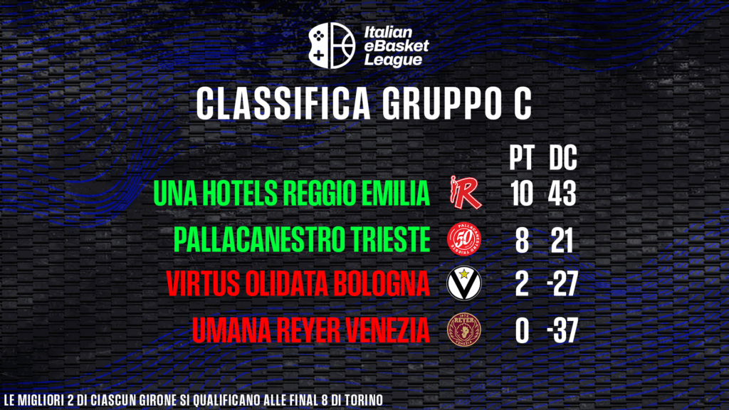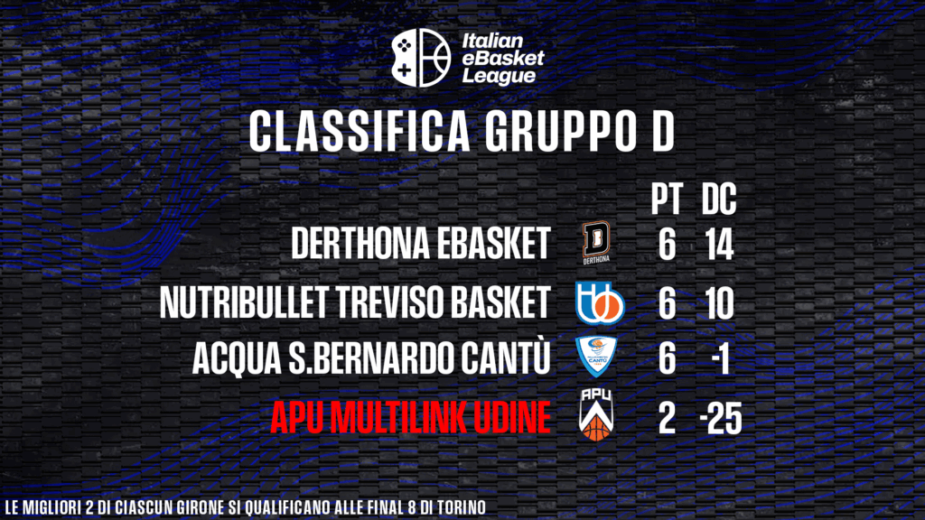Dulcis in fundo, il complicatissimo Girone D. La Multilink Udine pesca la gara perfetta contro la più accreditata Nutribullet, domata 22-13. E’ un successo che non può dare speranze ai friuliani, condannati all’ultimo posto, ma rimescola le carte nel gruppo. Decisivo anche il trionfo del Derthona eBasket su Cantù (22-20, con canestro della vittoria firmato da Marco Calvarese “NotMaizee”), che proietta i leoni a quota 6 punti, esattamente come canturini e veneti.