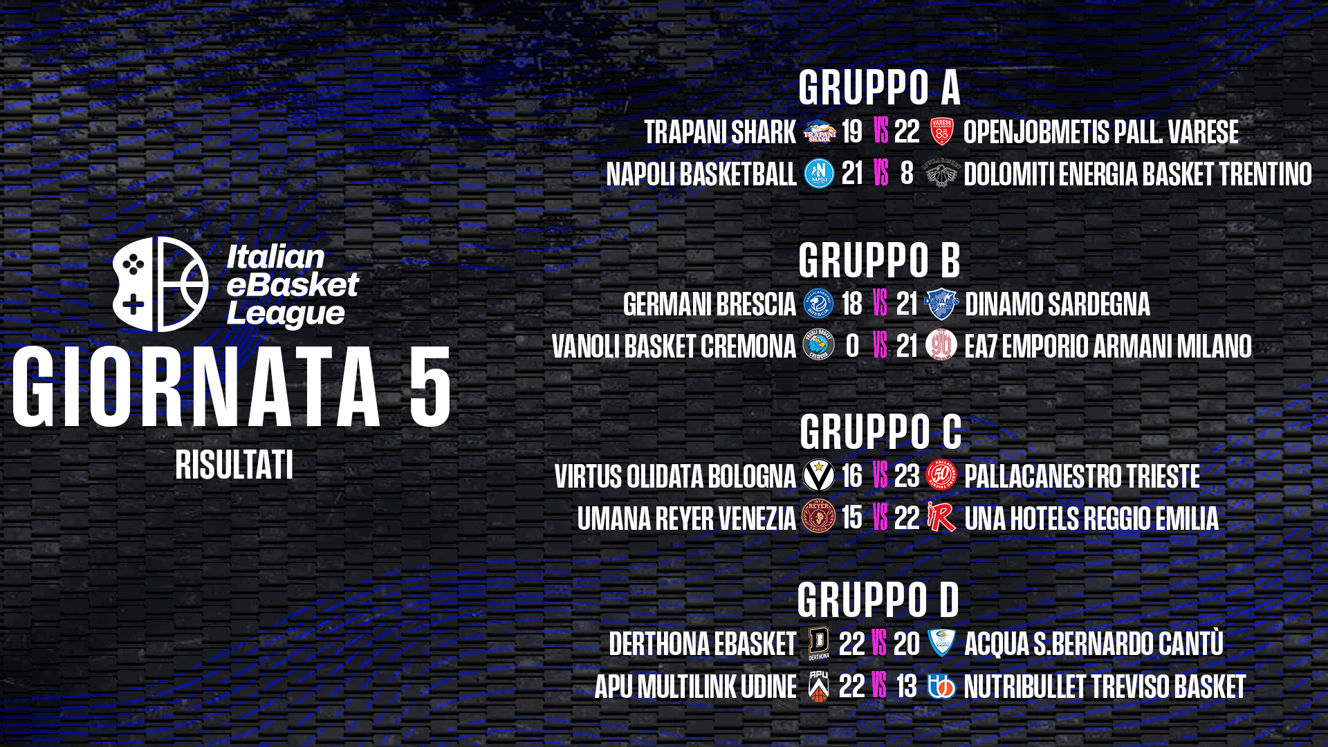 Dulcis in fundo, il complicatissimo Girone D. La Multilink Udine pesca la gara perfetta contro la più accreditata Nutribullet, domata 22-13. E’ un successo che non può dare speranze ai friuliani, condannati all’ultimo posto, ma rimescola le carte nel gruppo. Decisivo anche il trionfo del Derthona eBasket su Cantù (22-20, con canestro della vittoria firmato da Marco Calvarese “NotMaizee”), che proietta i leoni a quota 6 punti, esattamente come canturini e veneti.