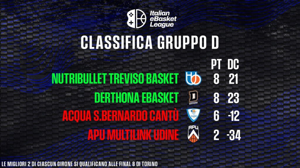 Si districa all’ultima giornata la matassa del Girone D. La Nutribullet Treviso vince la dentro/fuori contro l’Acqua San Bernardo Cantù 22-11. Vittoria pesante che porta l’Universo in vetta alla classifica, condivisa che il Derthona eBasket, che si è imposta alla Multilink Udine per 22-13.